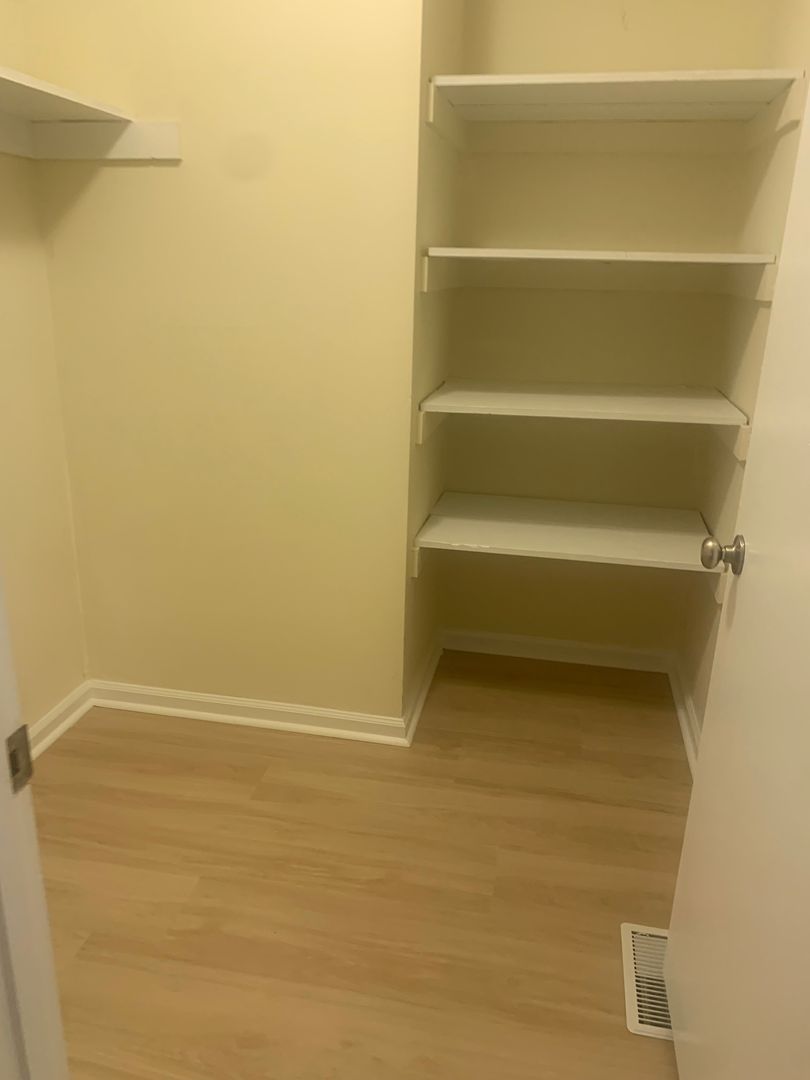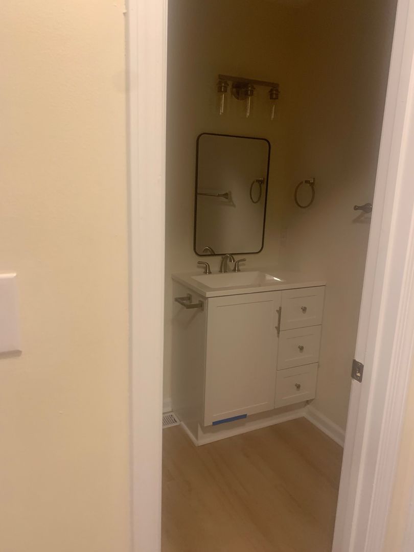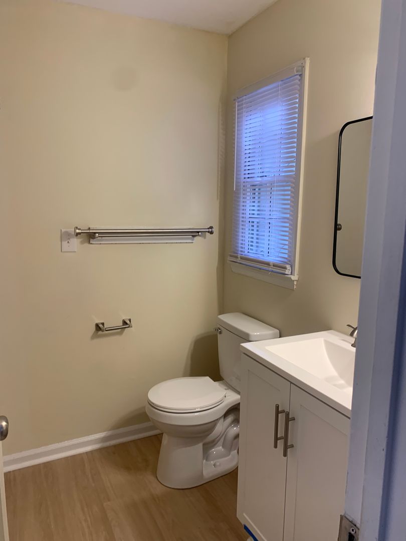 A full bathroom has a new vanity and new lighting. Bring your own washer and dryer and close the door to your separate laundry room, complete with cabinets for storage and linens. The primary bath has been updated with a new white vanity and modern lighting and includes a shower.