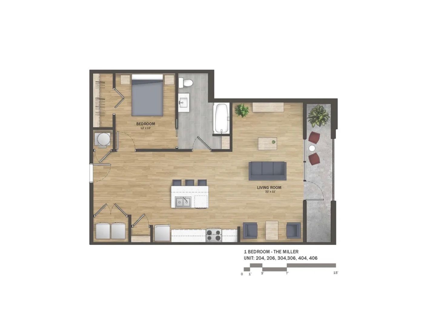 Experience elevated living in our 1 Bedroom, 1 Bath Miller floor plan, featuring a gracious foyer that opens to a chef-inspired kitchen with a center island and stainless steel appliances. Enjoy an open living room, a spacious walk-in closet, and more. Step outside onto your oversized private balcony, perfect for relaxing or entertaining. Plus, enjoy the convenience of an in-unit washer & dryer.