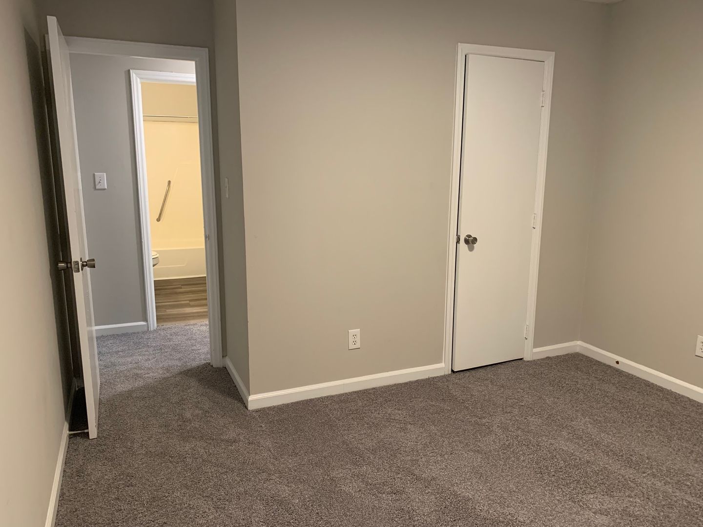 Laminate flooring runs throughout the main living areas, with carpet in the hallway and both bedrooms for added comfort. Washer and dryer hookups are located in the hall bathroom. The primary bedroom features a spacious walk-in closet.